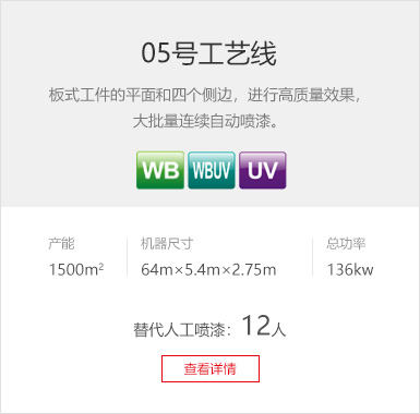 工藝要求 無溶劑uv底漆、水性面漆 產(chǎn)品種類 木門、門套、線條 產(chǎn)線數(shù)量 6條 設備特色 水性色漆的高質量噴涂 生產(chǎn)產(chǎn)能 色漆噴涂線:400套門/8h (生產(chǎn)員3人/線)