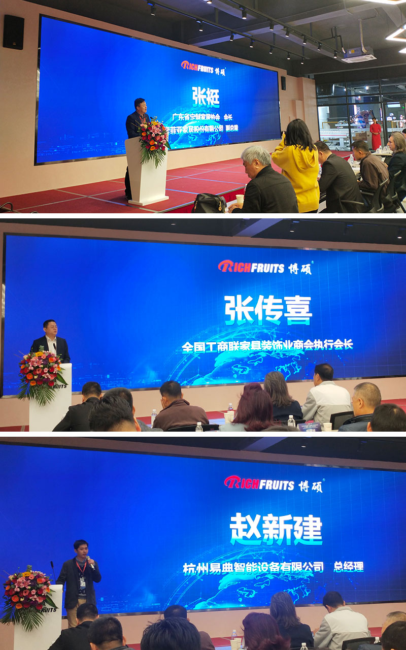 同時,廣東省定制家居協(xié)會會長索菲亞副總裁張挺、全國工商聯(lián)家具裝飾商會執(zhí)行會長張傳喜、杭州易典智能設備總經理趙新建都為博碩涂裝一體化智能體驗館點贊!尤其索菲亞副總裁張挺張總高度贊揚了博碩的智能涂裝系統(tǒng),現(xiàn)國內甚至是全世界最先進的智能涂裝系統(tǒng)落地于蘭考索菲亞工廠。