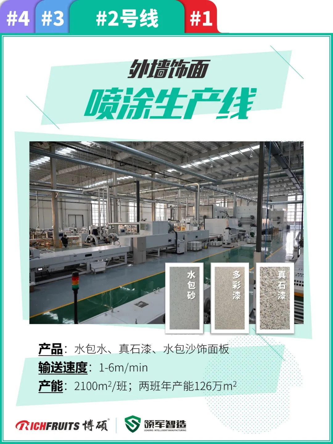 博碩涂裝一體化解決方案2.0的核心“整廠方案交付”;博碩交付領(lǐng)軍的主體由4條先進的生產(chǎn)線構(gòu)成,制造UV轉(zhuǎn)印飾面板,UV實色和膚啞飾面板,水包水、真石漆、水包沙飾面板,平貼包覆飾面板,保溫材料等產(chǎn)品——