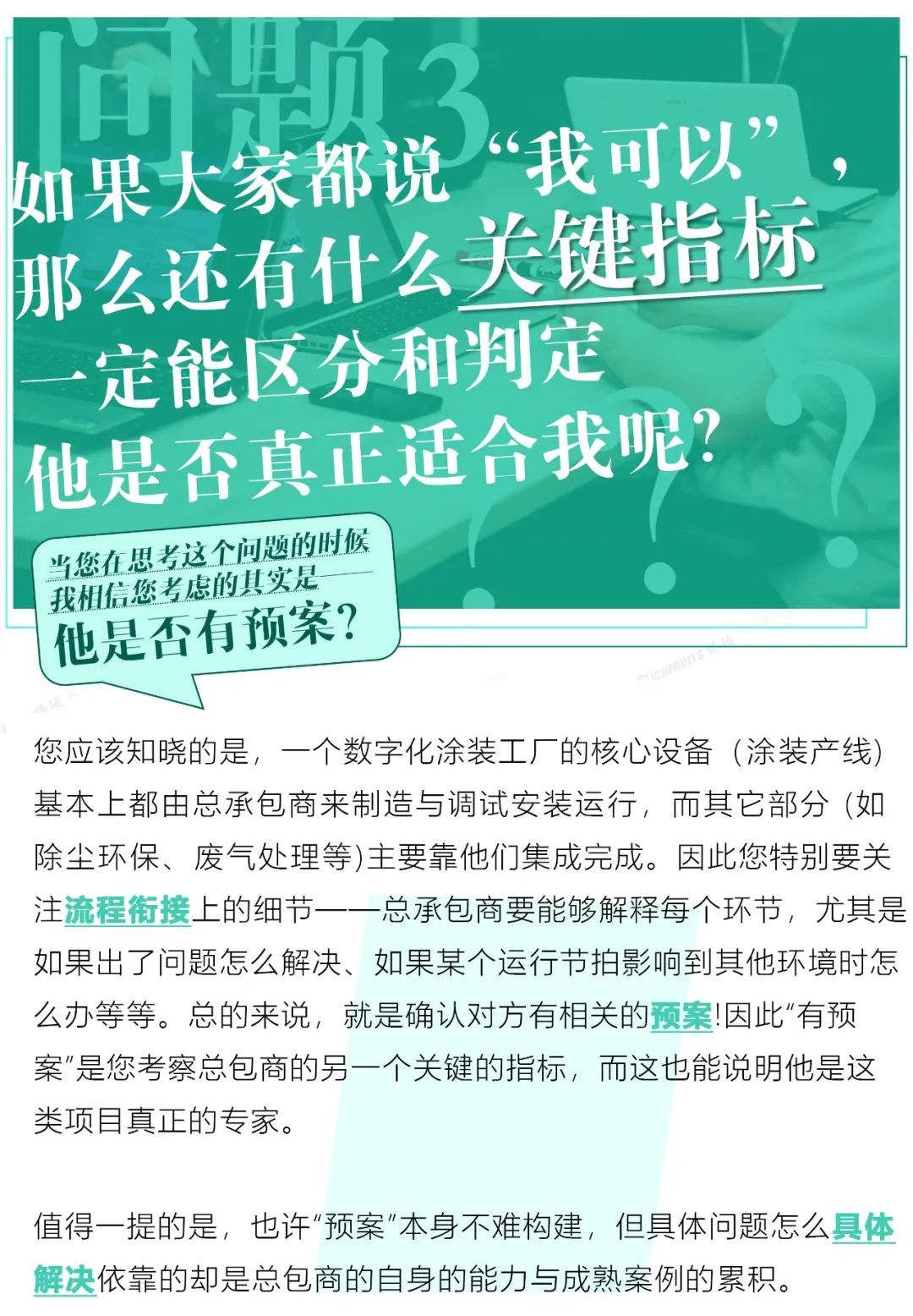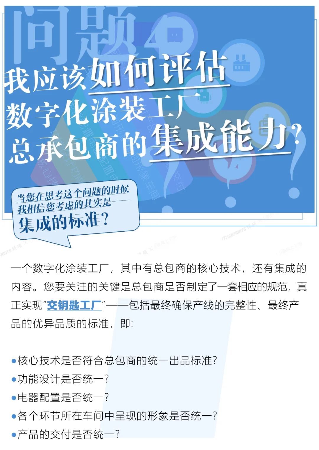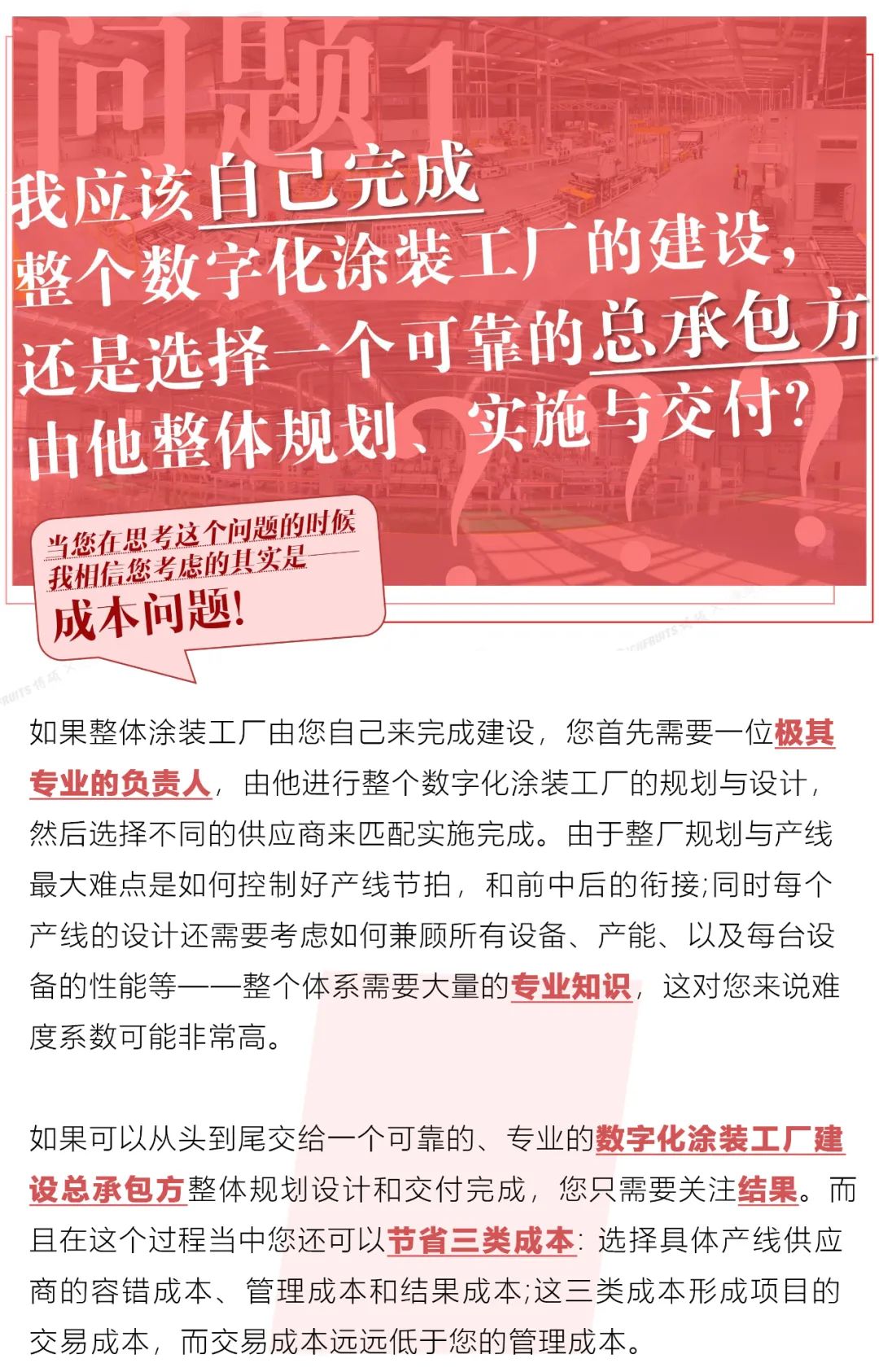 基于多元化材料,以及涂裝工藝本身的專業(yè)性,一個(gè)投資有效的數(shù)字化涂裝工廠和羅馬城一樣,并不容易建,更不是朝夕之間就能建立起來(lái)的。那么,有這樣需求的您在考慮上述的需求與解決方式的時(shí)候,您一定要從以下5件事先去思考和判斷。