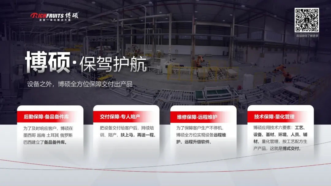 4)技術保障 21年博碩提出涂裝一體化應用技術六要素:工藝、設備、基材、環(huán)境、人員、輔材。博碩過去21年的經(jīng)驗積累了大量的工藝參數(shù),形成了工藝配方大數(shù)據(jù),量化管理去人為化不依賴人出產(chǎn)品,這就是博式交付。