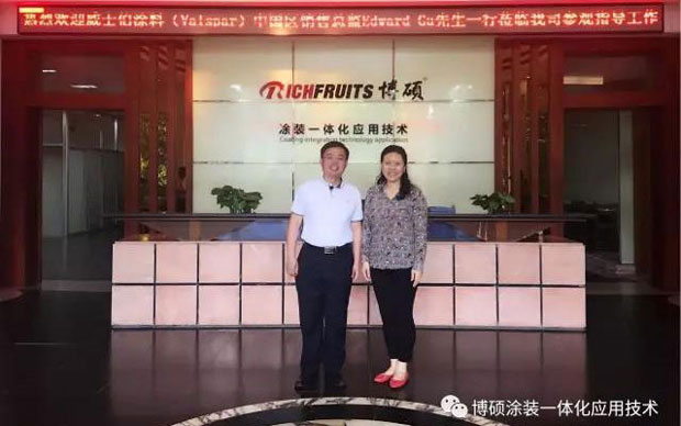 七月的盛夏,瓦藍(lán)色的天空沒有一絲的彩云,火熱的太陽炙烤著大地,這么悶熱的天氣還是阻擋不了博碩那熱辣辣的心,有幸在今天博碩迎來威士伯涂料(Valspar)中國區(qū)銷售總監(jiān)Edward Gu先生帶著威士伯強(qiáng)大的精英團(tuán)隊(duì)蒞臨我司參觀指導(dǎo)工作。包括UV、水性UV、水性漆研發(fā)老總以及各產(chǎn)品的老總及各區(qū)域市場部的老總。個(gè)個(gè)都是化工專業(yè)的高級(jí)精英人士。