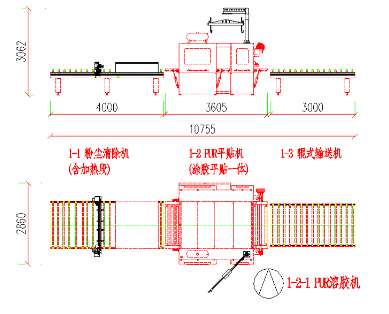 本生產(chǎn)線由:粉塵清除機(jī) — PUR平貼機(jī)(含溶膠系統(tǒng)) — 輸送機(jī)等部分組成。