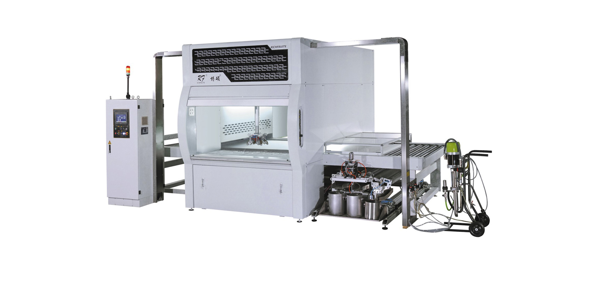 適用于實木家具、實木復(fù)合門、美式櫥柜、套房家具、衛(wèi)浴柜、展示柜、工藝品、裝飾板、硅酸鈣板、玻鎂板等板式工件的平面(側(cè)邊少量涂到),針對UV、PU、AC、NC、水性漆和氟碳漆等,進(jìn)行高質(zhì)量效果連續(xù)自動噴漆,實現(xiàn)節(jié)能、環(huán)保和減少人工,提高產(chǎn)品質(zhì)量和生產(chǎn)效率。
