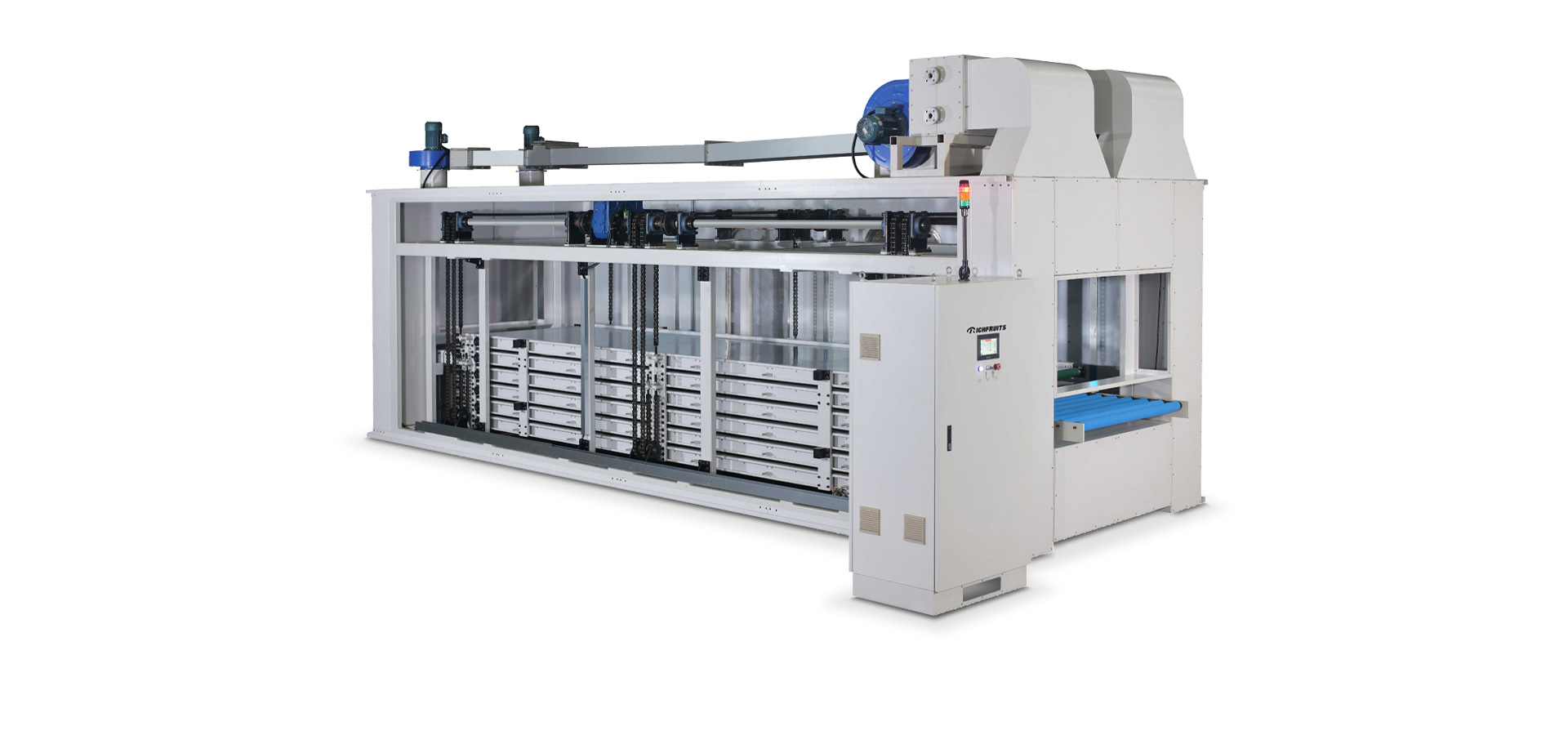 利用機(jī)器上部空間,采用立體式結(jié)構(gòu),適用于規(guī)格較為統(tǒng)一的實(shí)木家具、實(shí)木復(fù)合門(mén)、美式櫥柜、套房家具、衛(wèi)浴柜、展示柜、工藝品、裝飾板等板式工件,進(jìn)行自動(dòng)化噴漆后3~6分鐘的立體流平,減少流水式干燥隧道的長(zhǎng)度使用,節(jié)省場(chǎng)地。