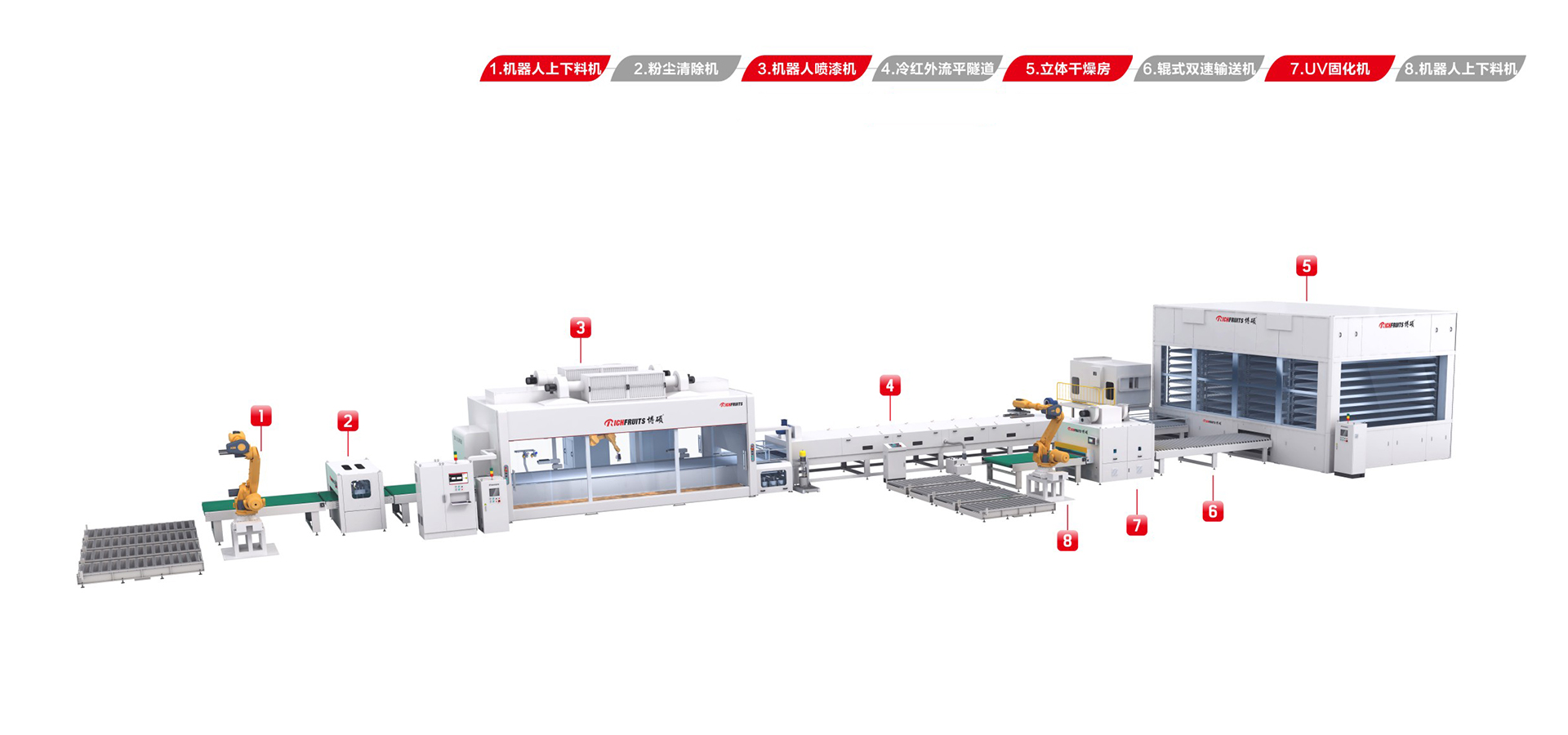 適用于板式家具、實(shí)木門、櫥柜門、工藝品、裝飾板、硅酸鈣板、玻鎂板、水泥纖維板的板式加工件的平面和四個(gè)側(cè)邊進(jìn)行高質(zhì)量、大批量連續(xù)噴漆。