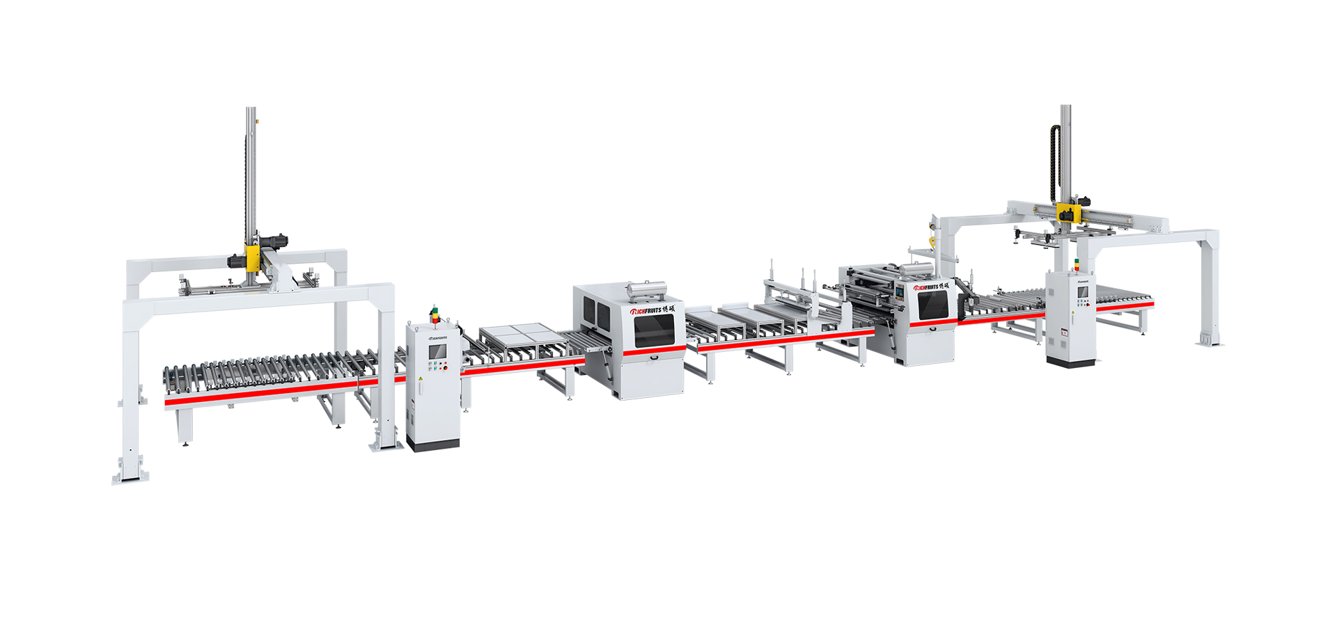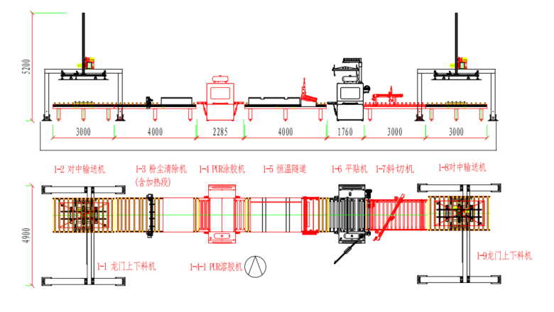 本生產(chǎn)線由:龍門上下料機(jī) — 對中輸送機(jī) — 粉塵清除機(jī) — PUR涂膠機(jī) — 恒溫隧道 — PUR平貼機(jī) — 斜切機(jī) — 對中輸送機(jī) — 龍門上下料機(jī)等部分組成。