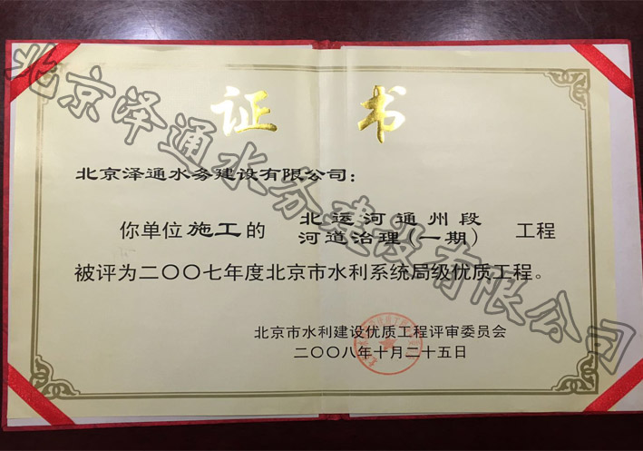 2007年度北京市水利系統(tǒng)局級(jí)優(yōu)質(zhì)工程證書
